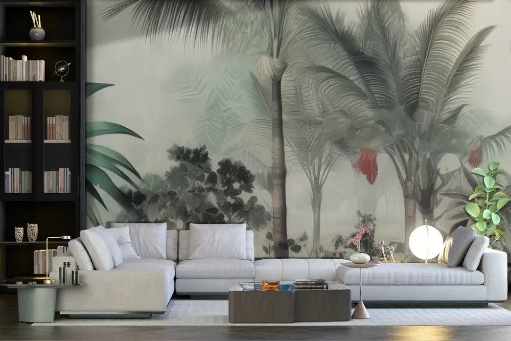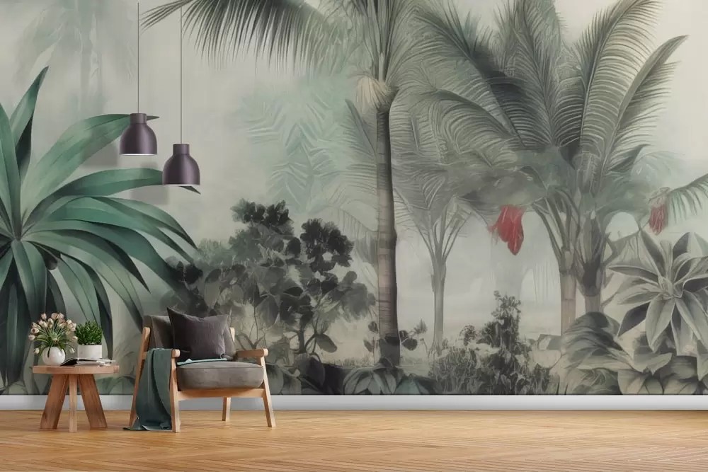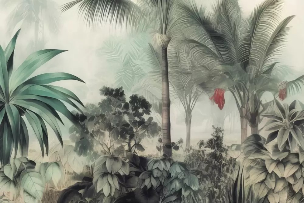 Carta da parati paesaggio tropicale effetto nebbia vintage, vivace e naturale. Ideale per zone notte e living. Ecologica e personalizzabile.
