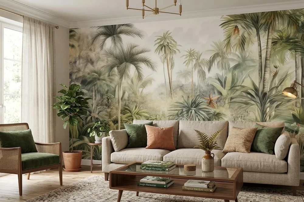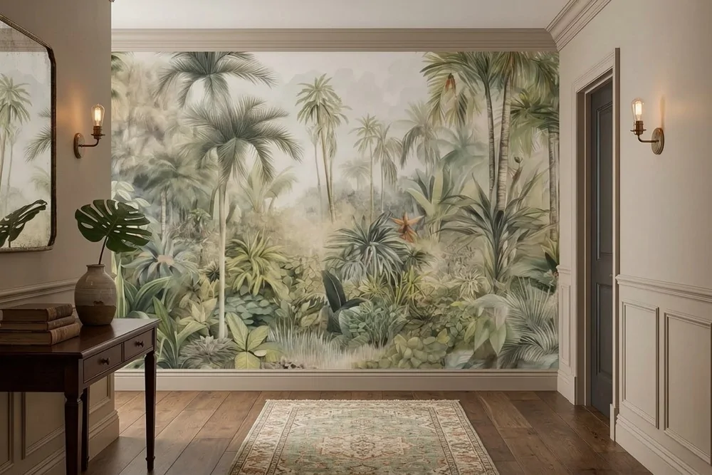 Carta da parati paesaggio giungla tropicale vintage, sofisticata e chic. Ideale per zone giorno luminose. Realizzata con materiali sostenibili.