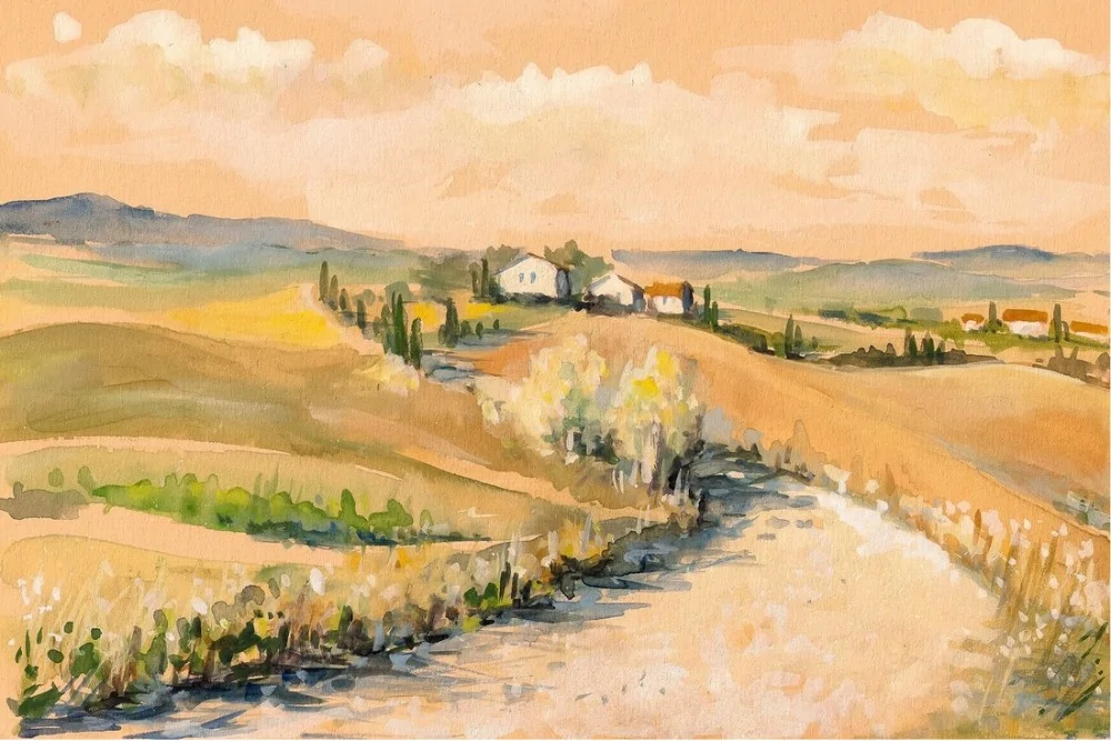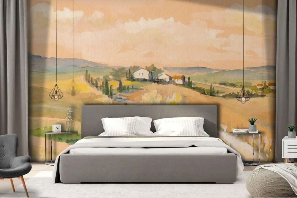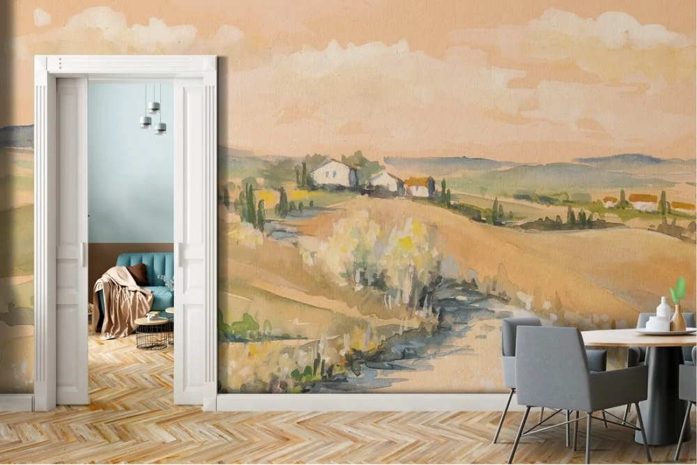Carta da Parati Dipinti e Acquerelli Alberi Natura Prati e colline