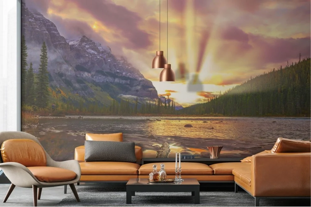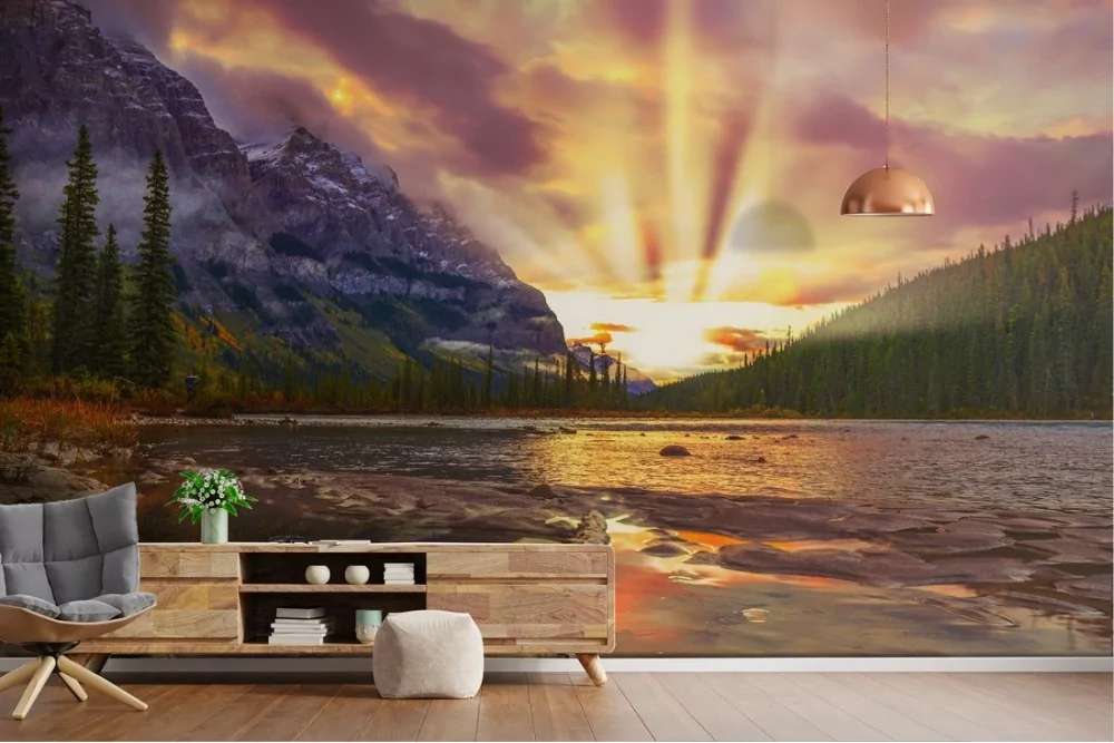 Carta da Parati lago tra montagne con foresta paesaggio