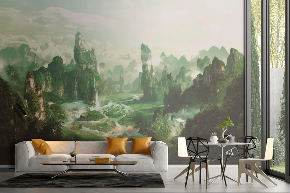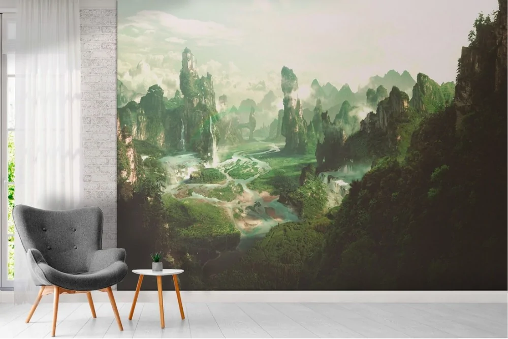 Carta da Parati paesaggio foresta tra montagne fantasy