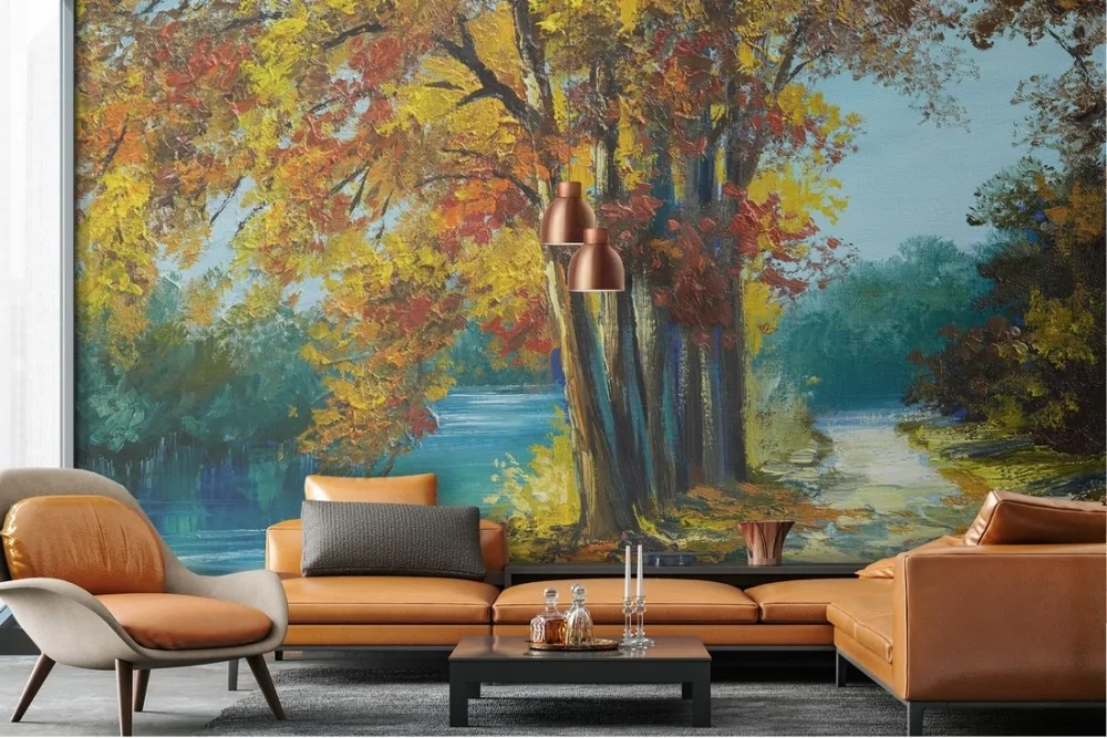 Carta da Parati strada nella foresta con fiume natura autunno