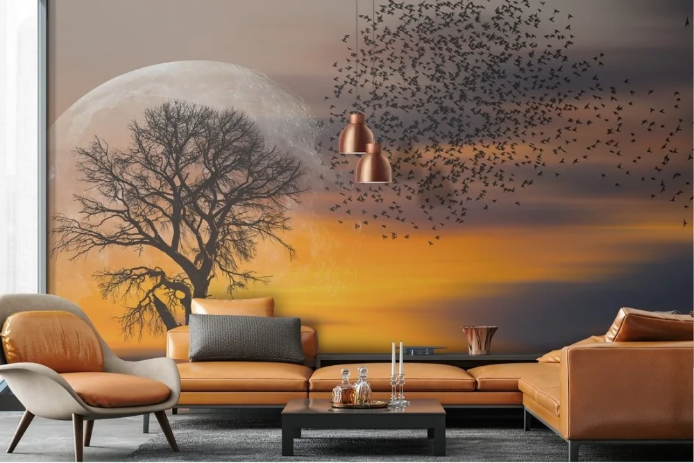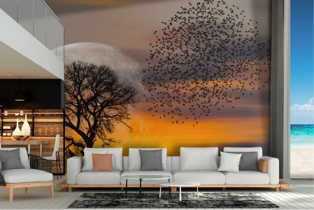 Carta da Parati paesaggio albero con stormo uccelli natura