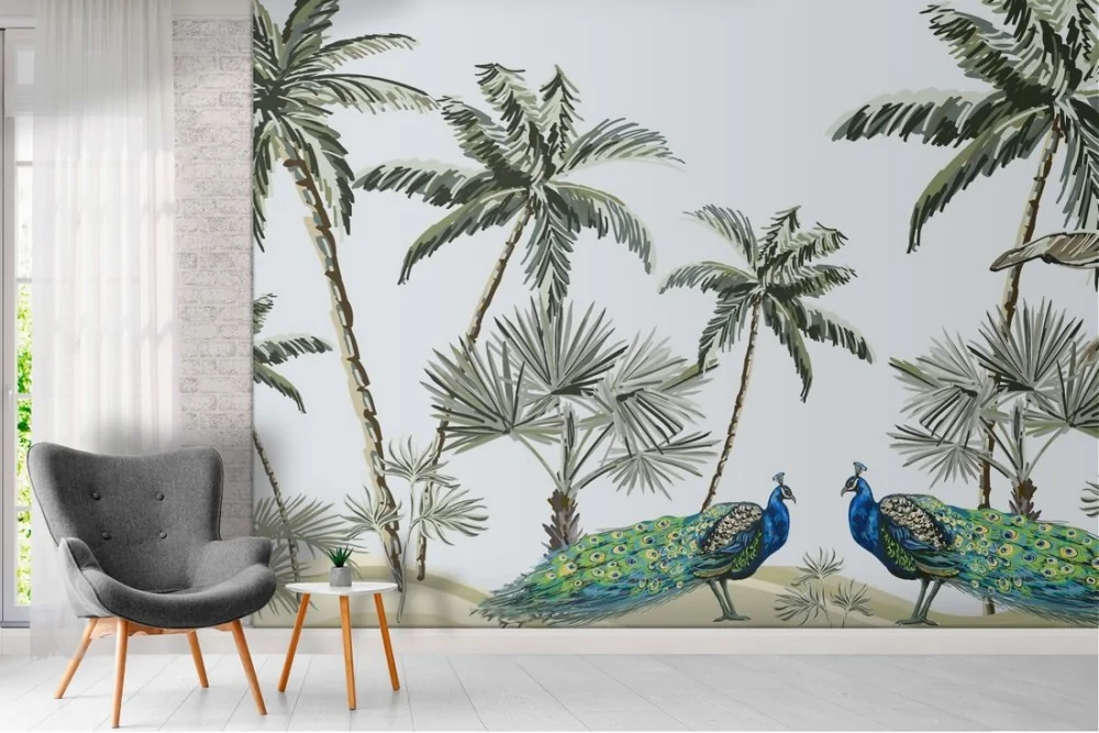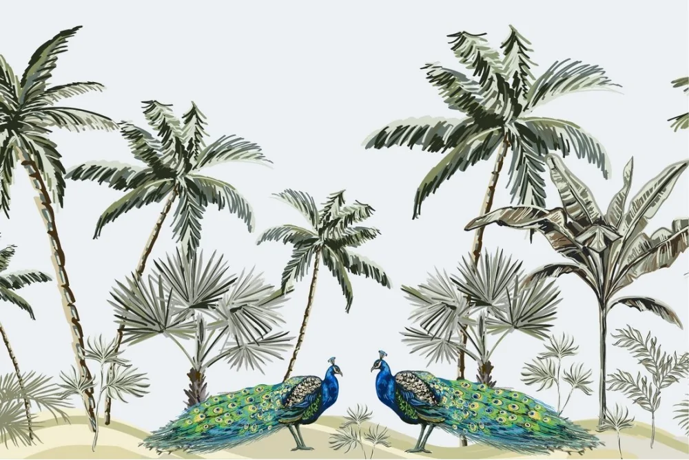 Carta da Parati palme tropicali e pavoni natura illustrazione