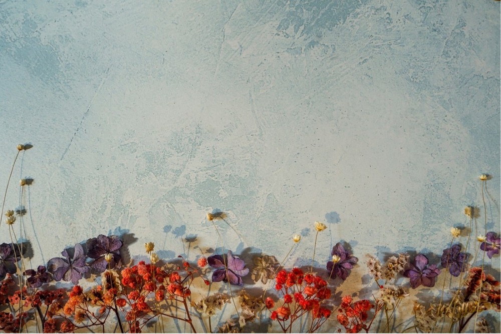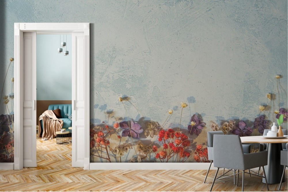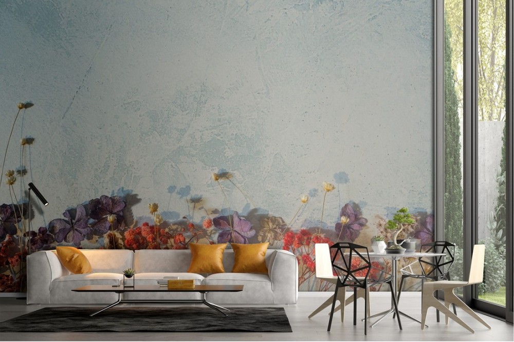 Carta da Parati superficie cemento azzurro con fiori appassiti-58
