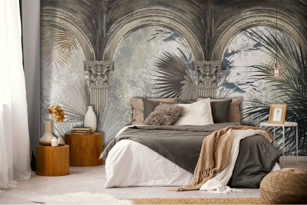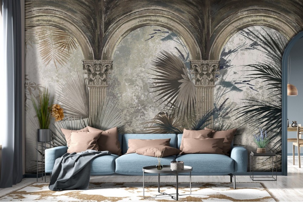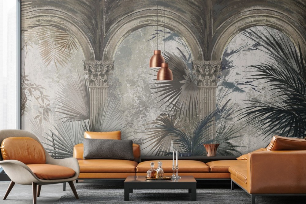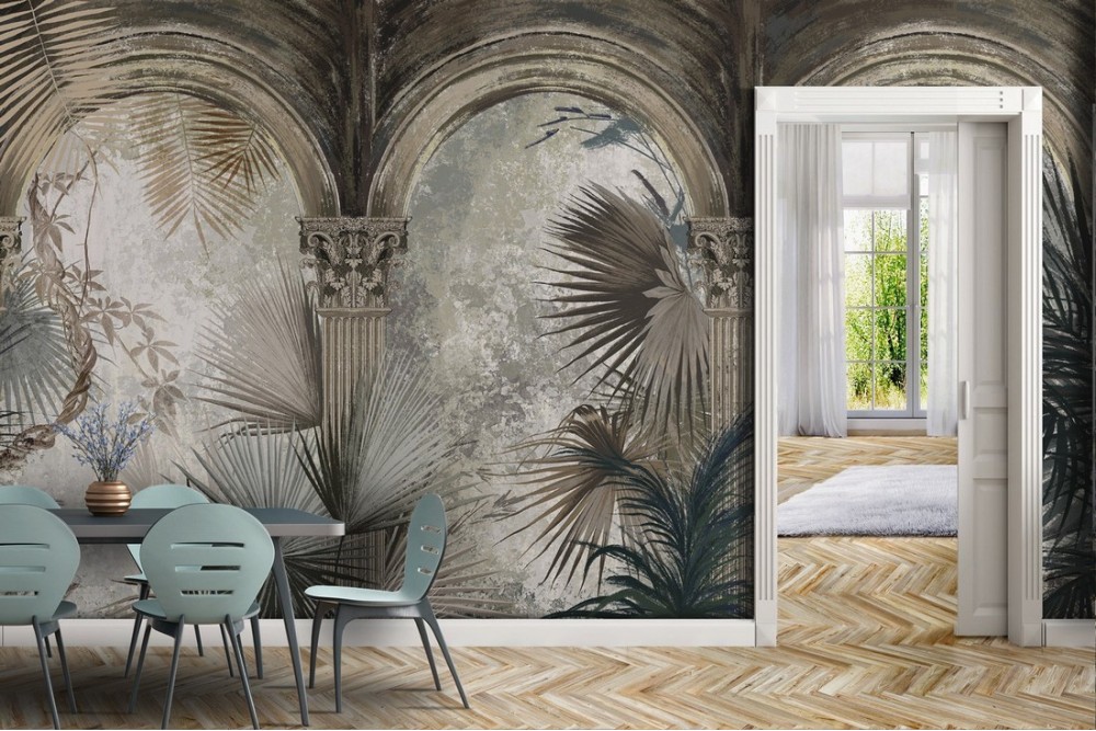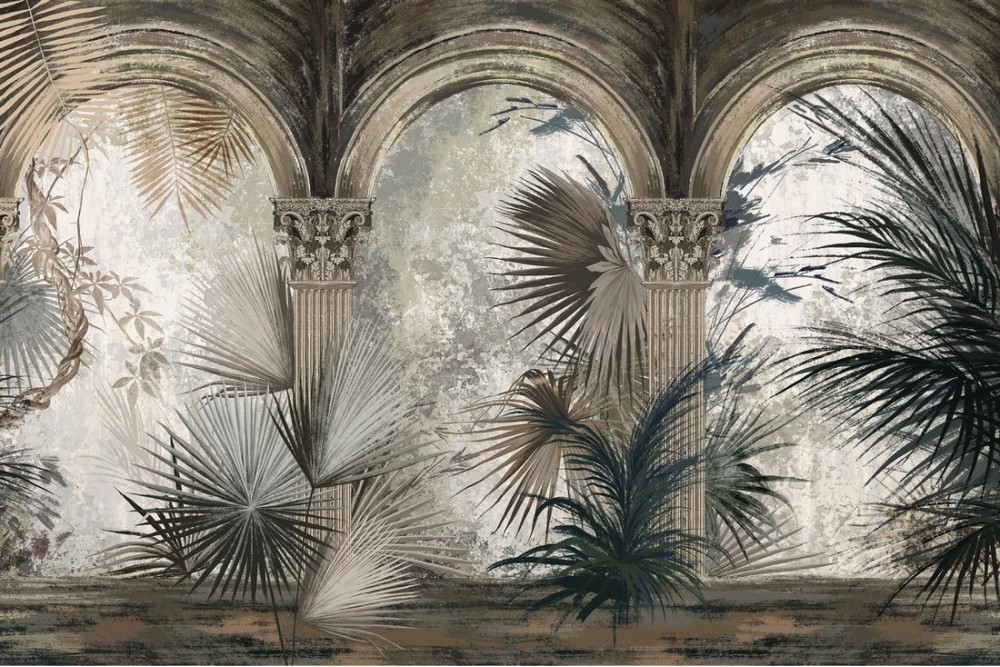 Carta da Parati fiori tropicali e dettagli muratura marmo-0259
